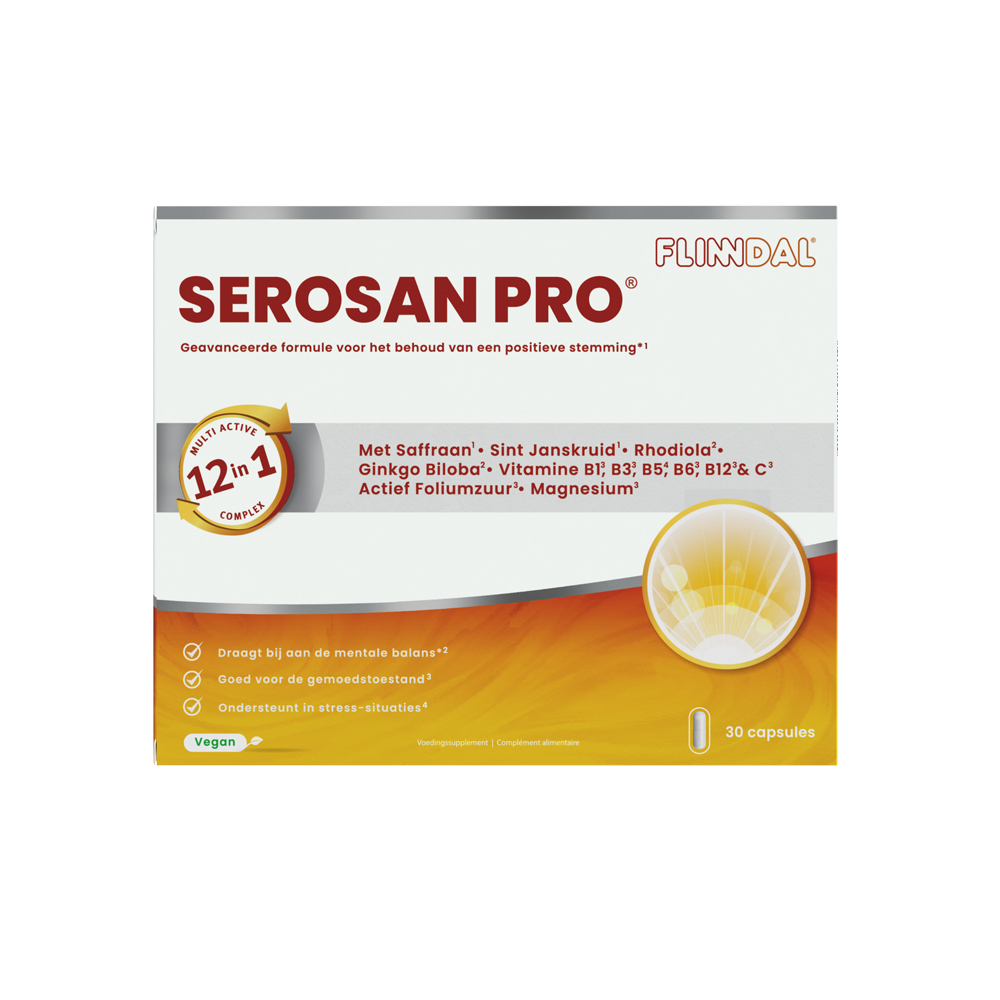 Serosan Pro® is een uitgebreid en innovatief supplement dat specifiek is samengesteld ter ondersteuning van een positieve stemming en mentale veerkracht. Dankzij de unieke combinatie van wetenschappelijk onderbouwde ingrediënten – waaronder saffraan (Safr’Inside®), Quatrefolic®, sint-janskruid, 5-HTP en drie belangrijke aminozuren – biedt het een krachtige en natuurlijke ondersteuning bij stemmingswisselingen, stress en verminderde gemoedstoestand.