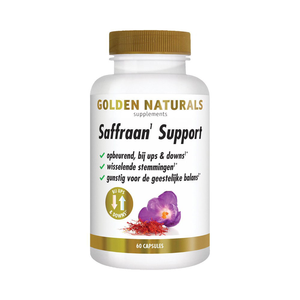 Saffraan Support van Golden Naturals is een doeltreffend en toegankelijk supplement voor wie op natuurlijke wijze zijn geestelijke balans en positieve stemming wil ondersteunen. De formule bevat een hoog gedoseerd saffraanextract, aangevuld met essentiële B-vitaminen (B1 en B6) en twee aminozuren die als voorlopers dienen voor serotonine en dopamine.